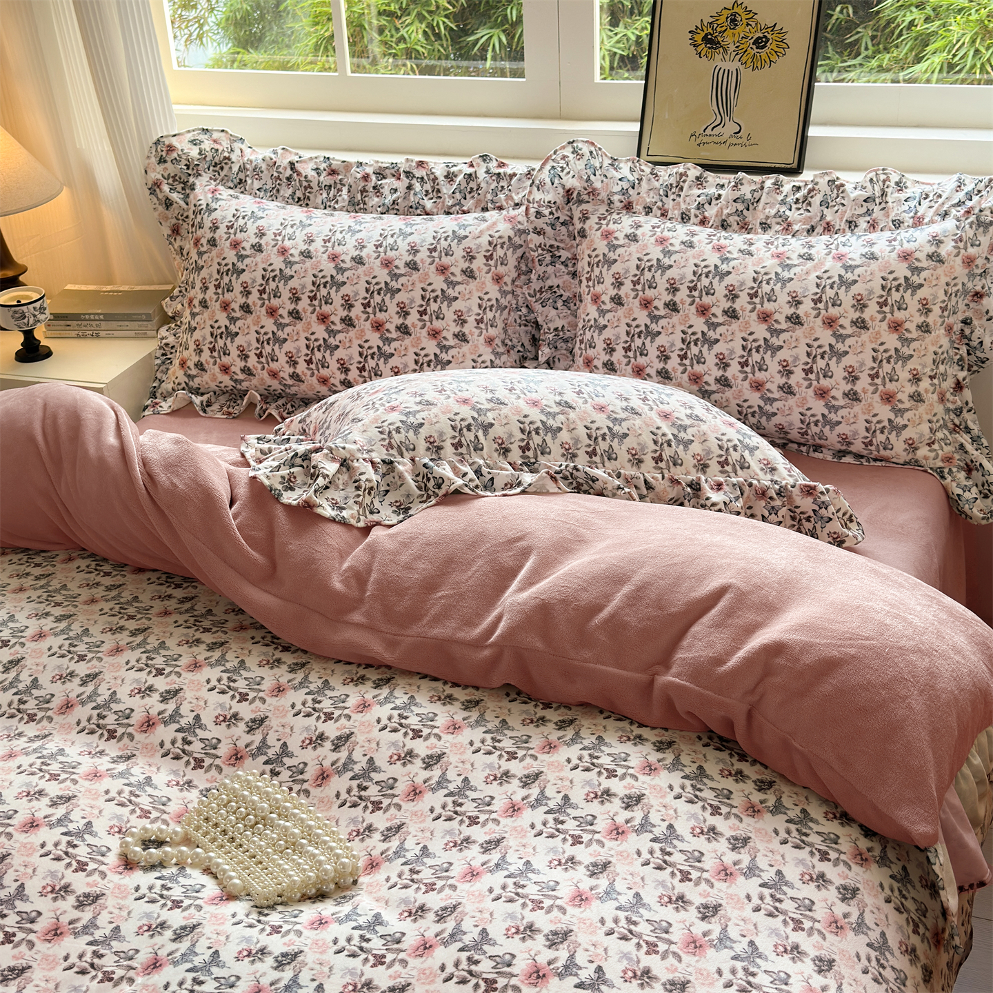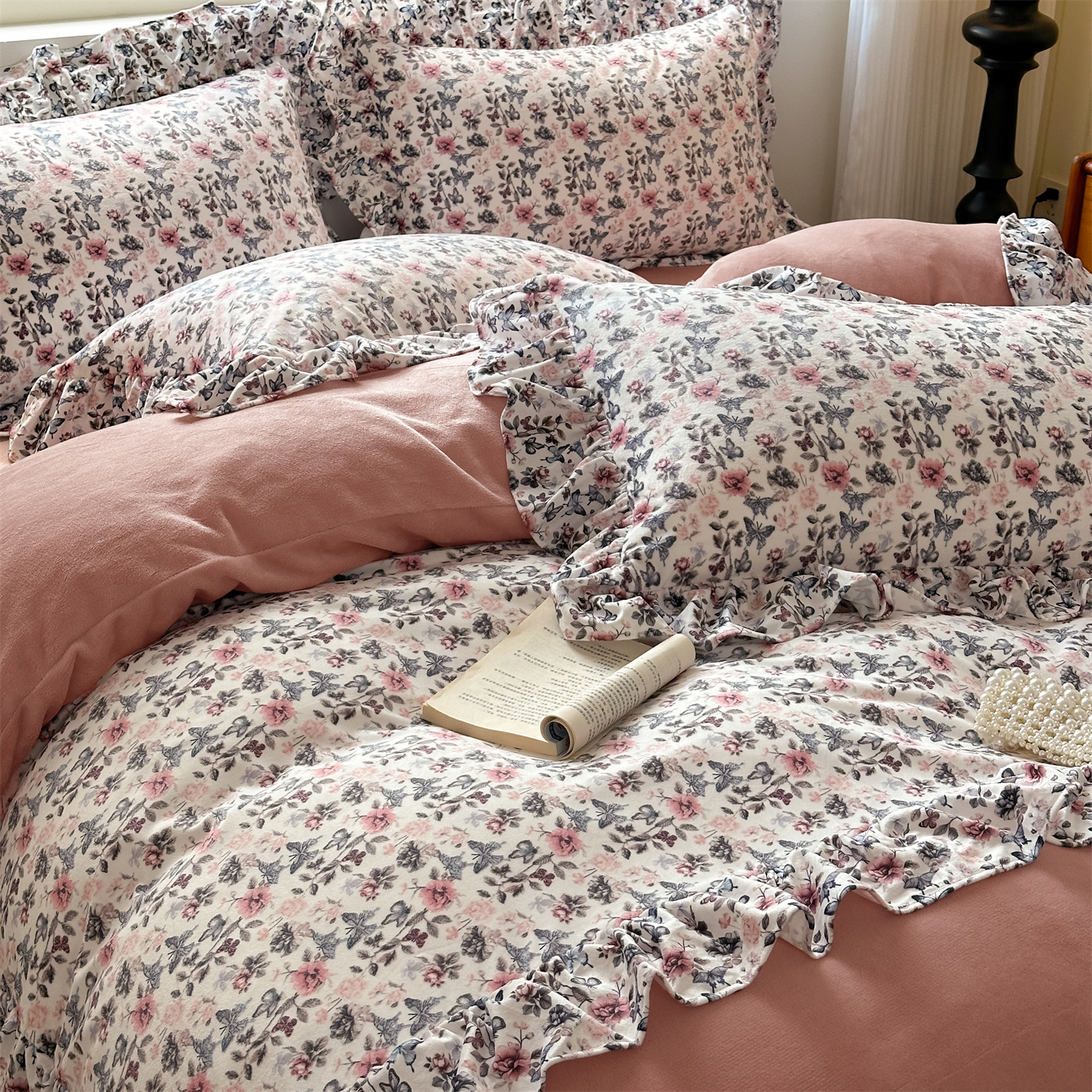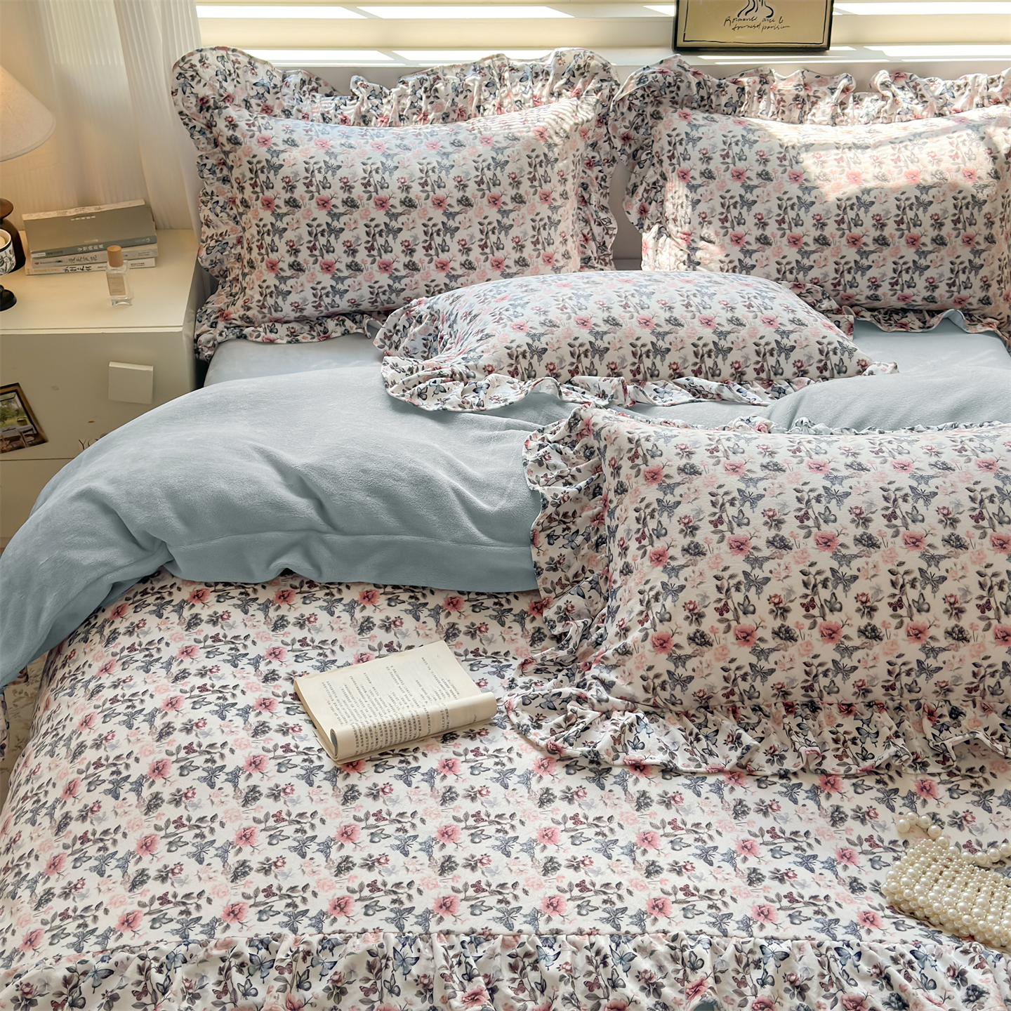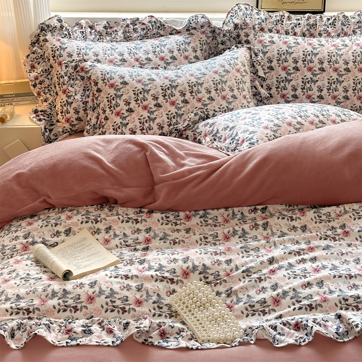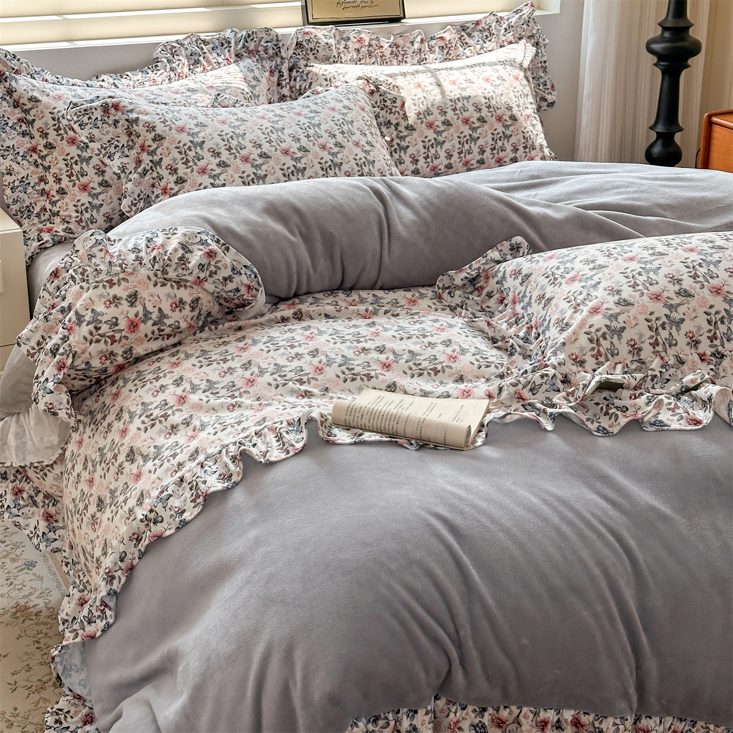 2025新款印花蝴蝶花边款牛奶绒宝宝绒四件套