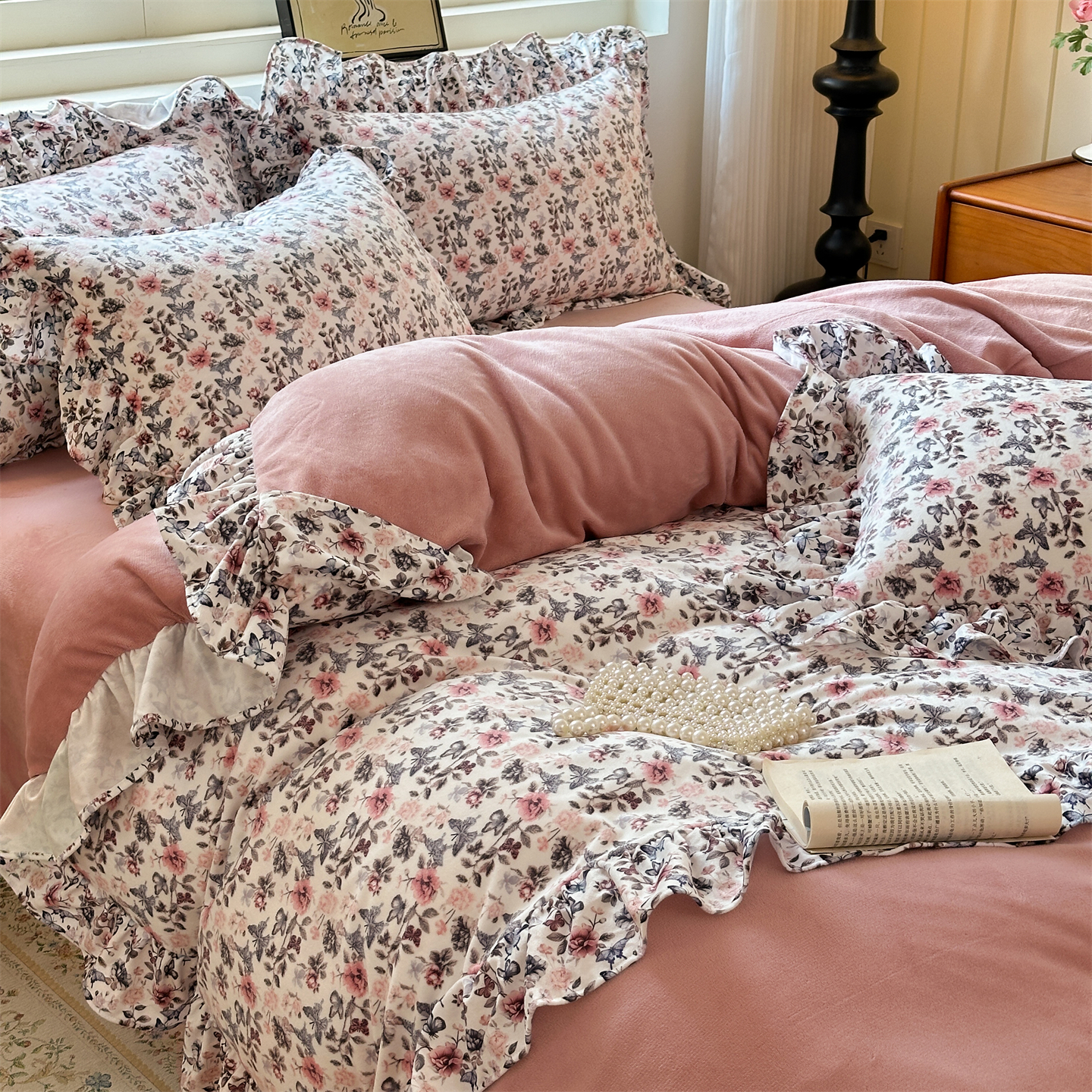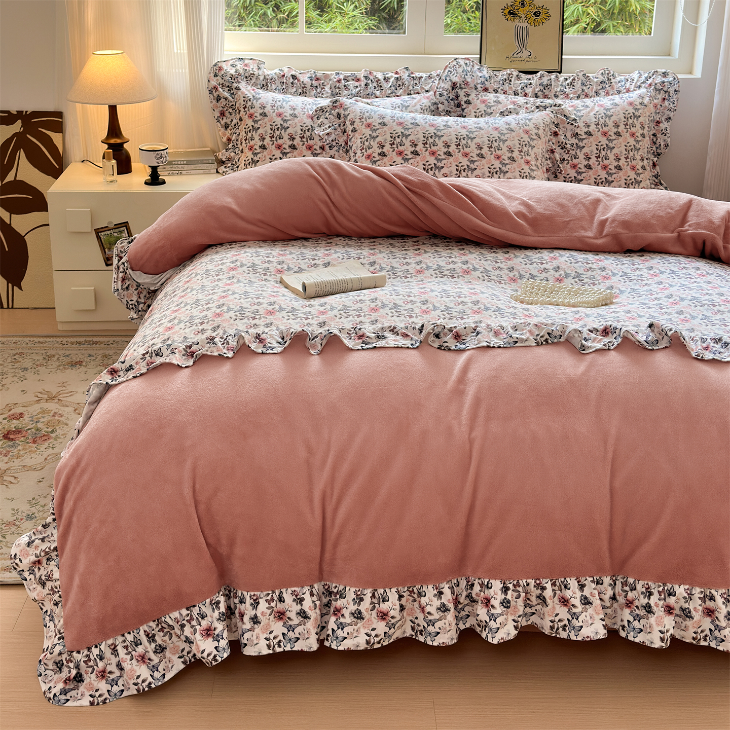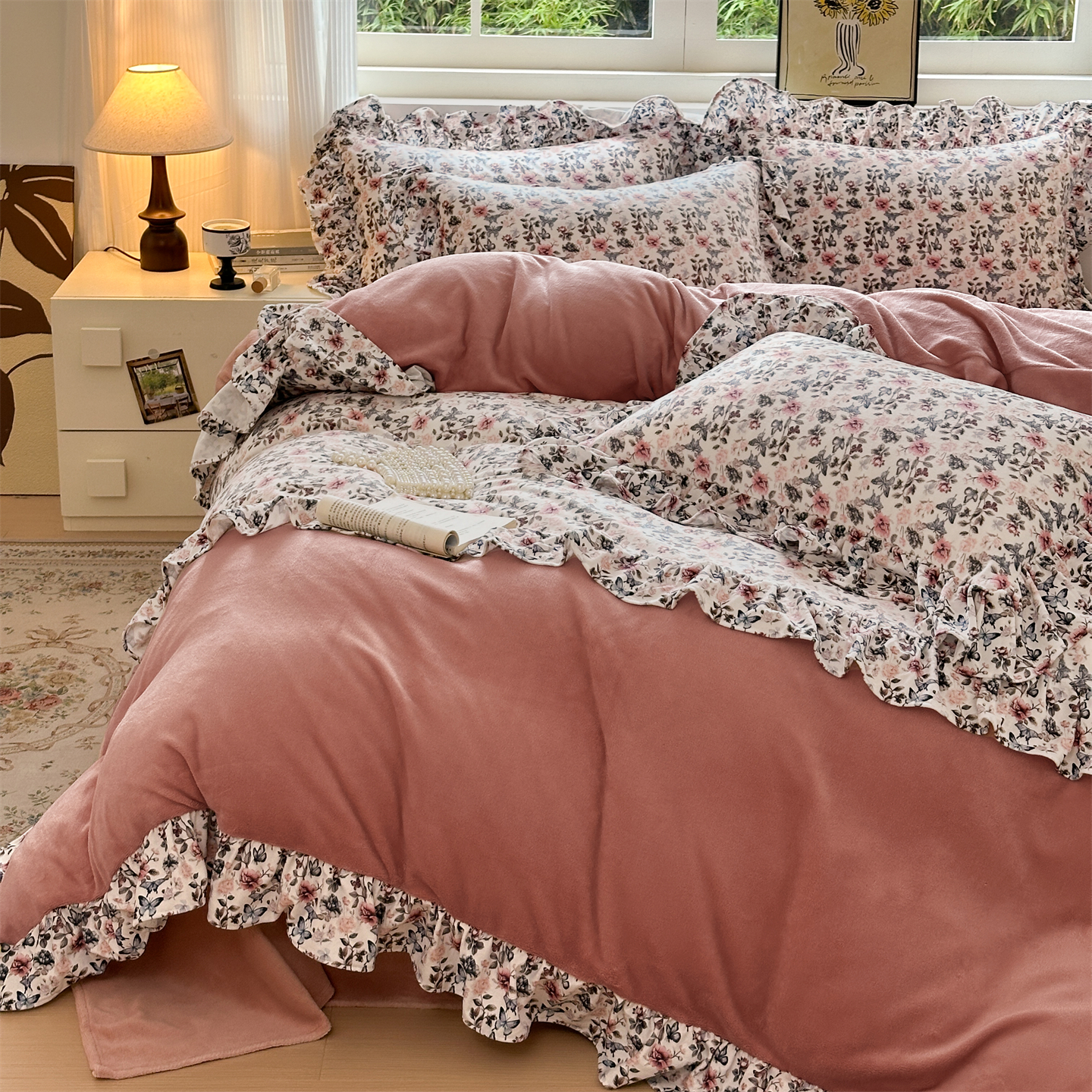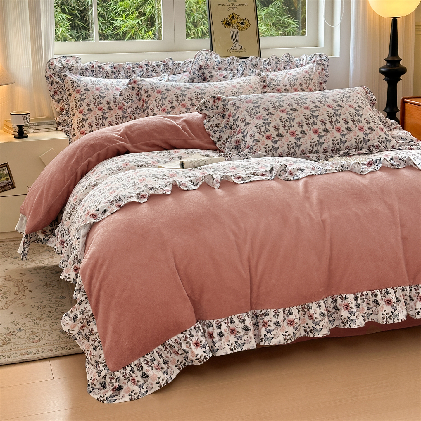 2025新款印花蝴蝶花边款牛奶绒宝宝绒四件套
