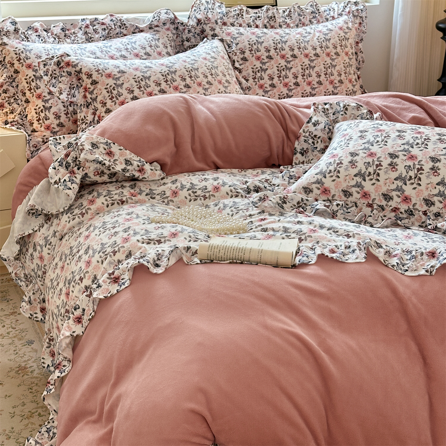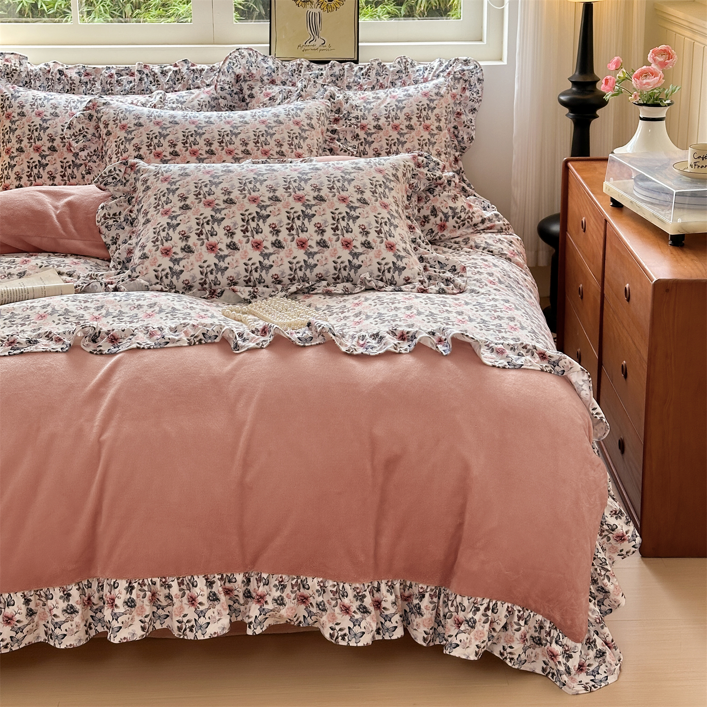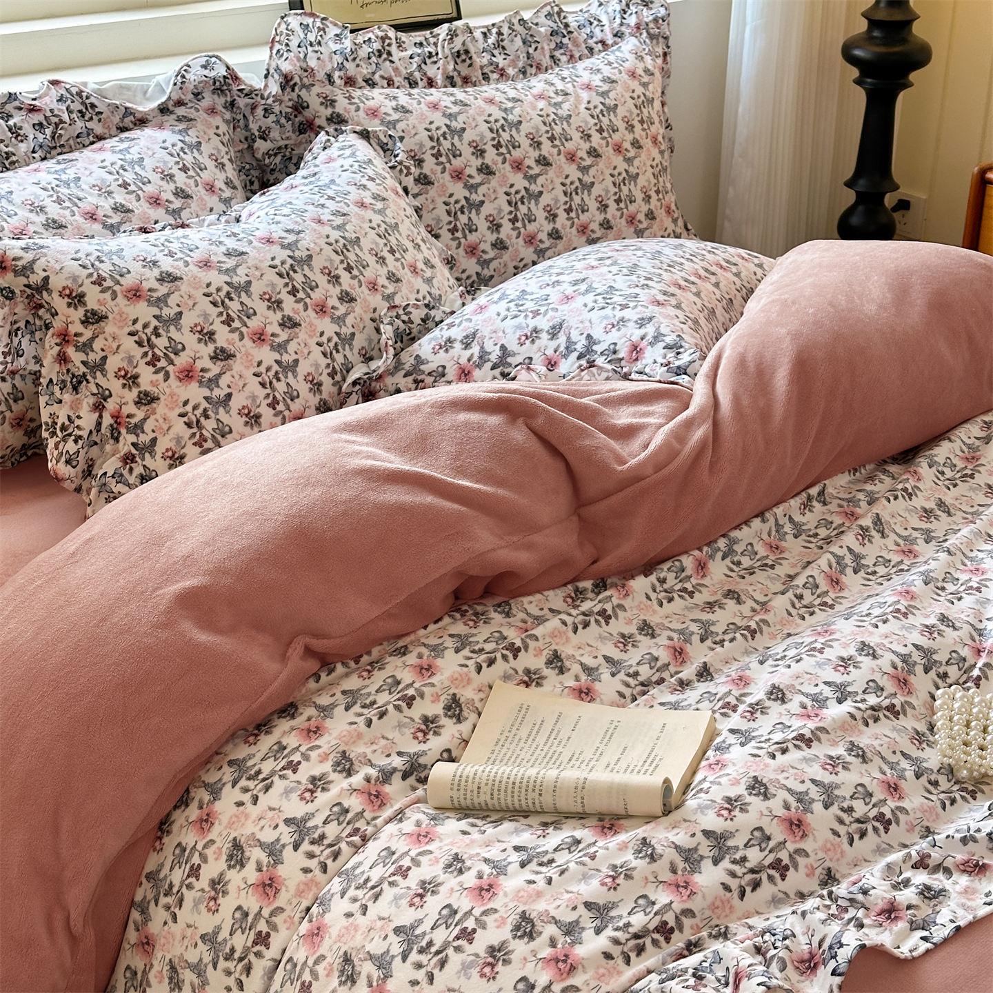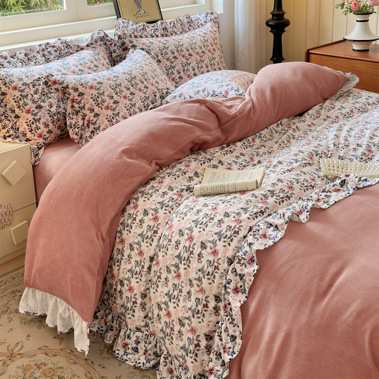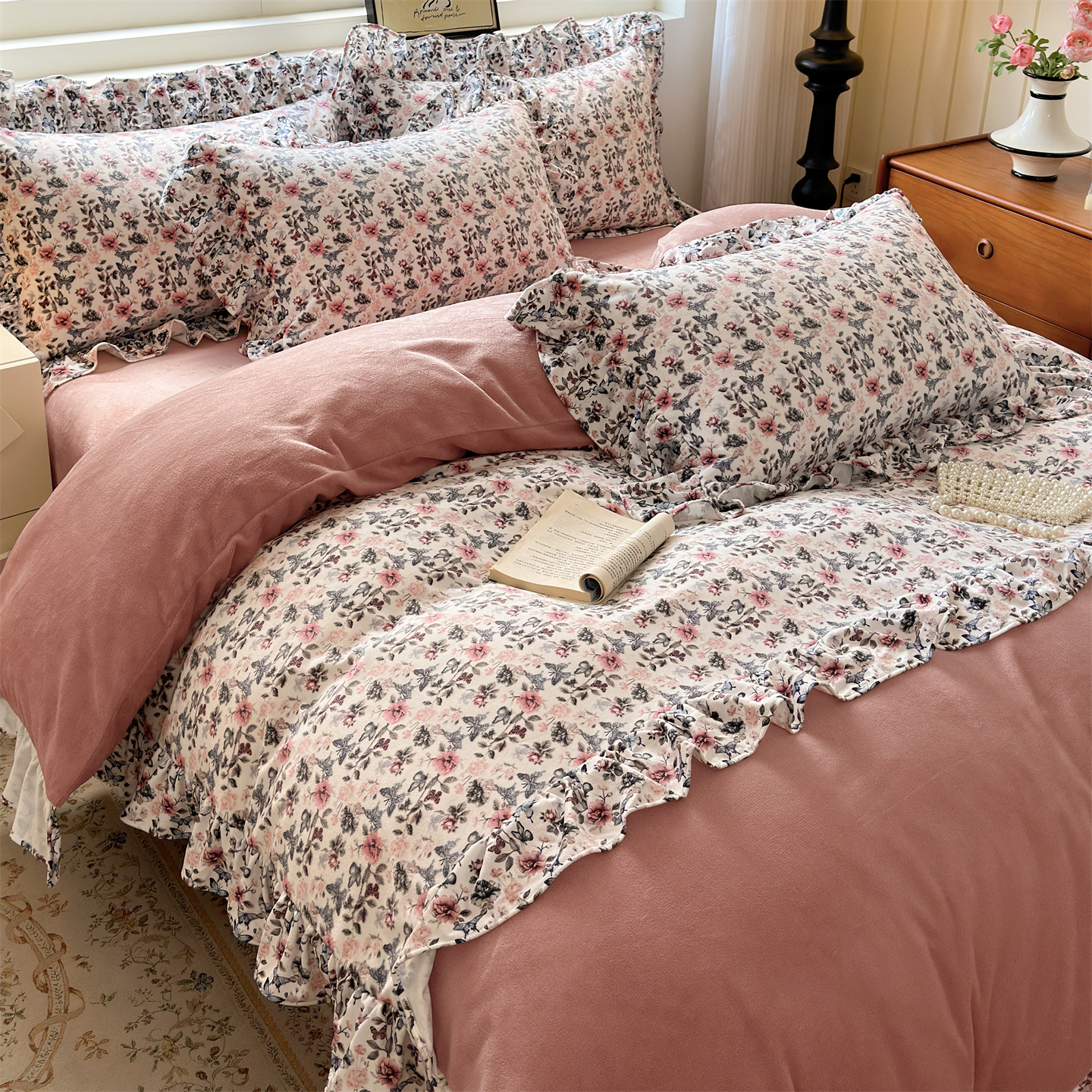 2025新款印花蝴蝶花边款牛奶绒宝宝绒四件套